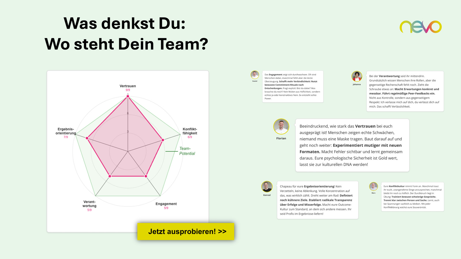 Beeindruckend, wie stark das Vertrauen bei euch ausgeprägt ist! Menschen zeigen Schwächen, niemand muss eine Maske tragen. Baut darauf auf und geht noch weiter: Experimentiert mutiger mit neuen Formaten. Macht Fehler sichtbar und lernt gemeinsam daraus. Eure psychologische Sicherheit ist Gold wert, lasst sie zur kulturellen DNA werden!